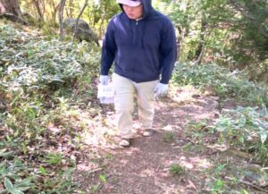 雨天の中、刈り払い機1人、プロワー1人計2名で作業道の草刈りをしながらヤマビルの生息調査を行いました。