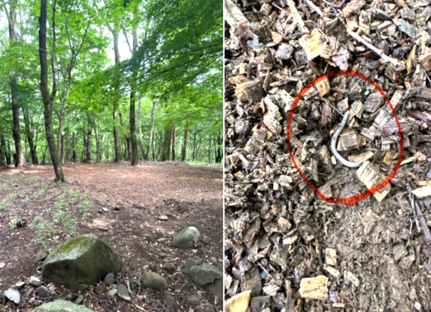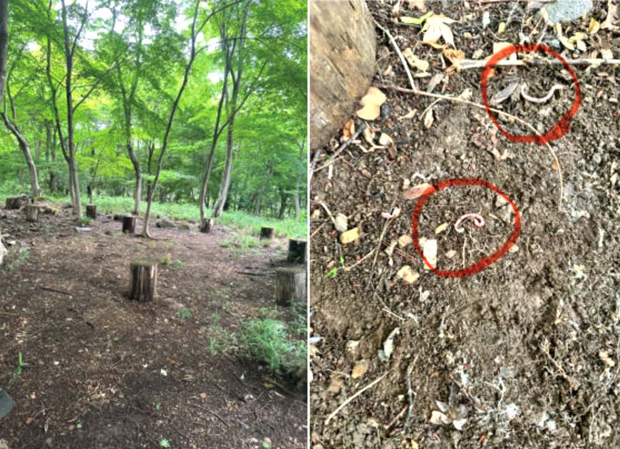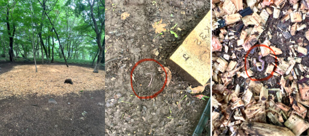 目視でのヤマビルの発生はありませんでした。周囲にあったレンガを動かしてみるとミミズが営巣していました。4月に8t程度ウッドチップを敷き積めた場所を掘り返してみるとやはりミミズが営巣していました。