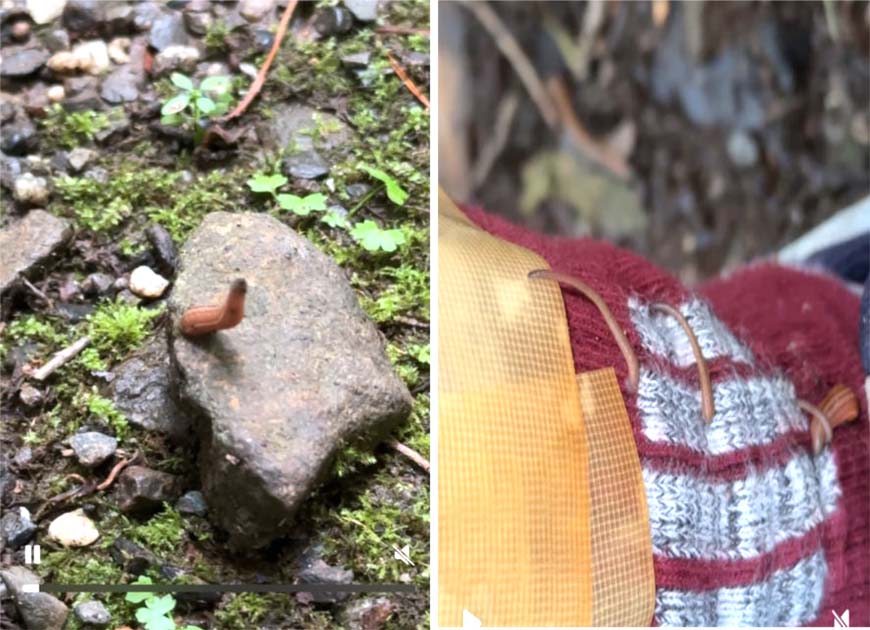 ヤマビルがこちらを補足してじっとしている状態(約60cm離れた状態)から 1分で右の写真スネ辺りまで登ってきます。ただ今回はシャーリーの効果が非常に高くて1頭もスネから上には登ってこれませんでした。