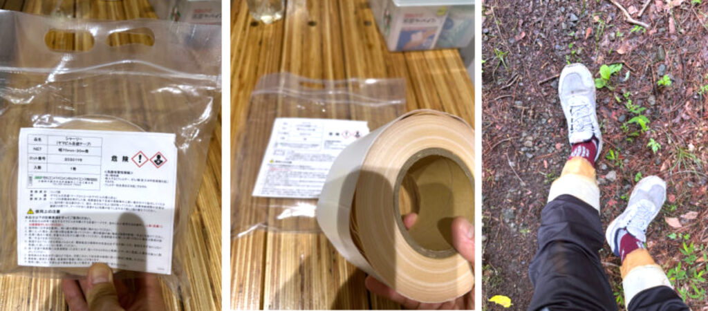その時自身のヤマビル対策はレギンスを装着するだけで30匹以上まとわりつき 6箇所吸血されました。今回は住化エンバイロメンタルサイエンスの鈴木様からヤマビル忌避テープ シャーリーをご提供していただきました。ズボンと靴下の隙間がなくなるようにテープで巻きつけました。シャーリーにはリンゴ酸が塗布されておりヤマビルを忌避するようにできています。シューズにはヒルノックを散布していきました。